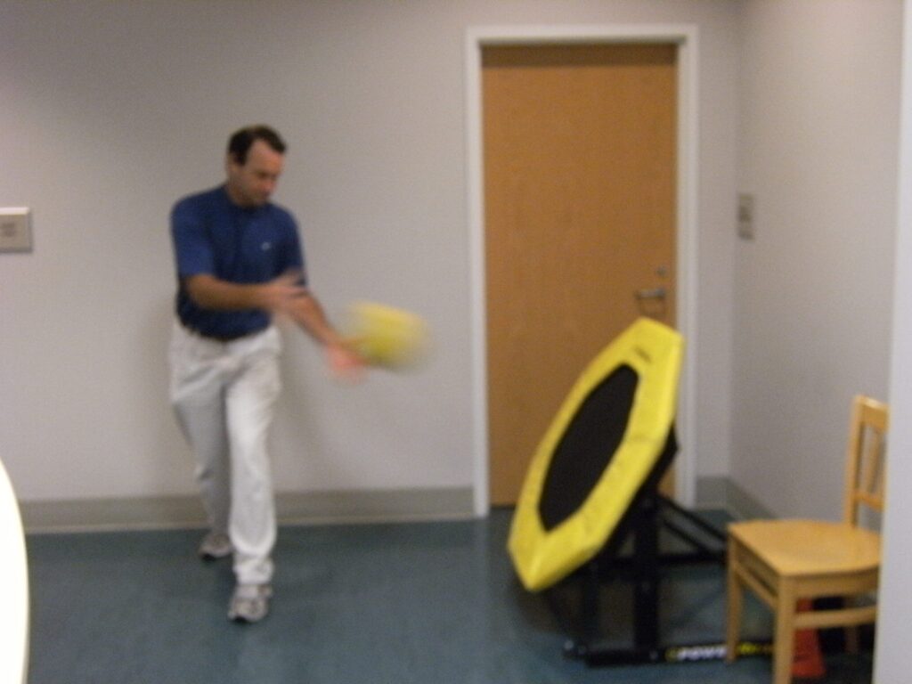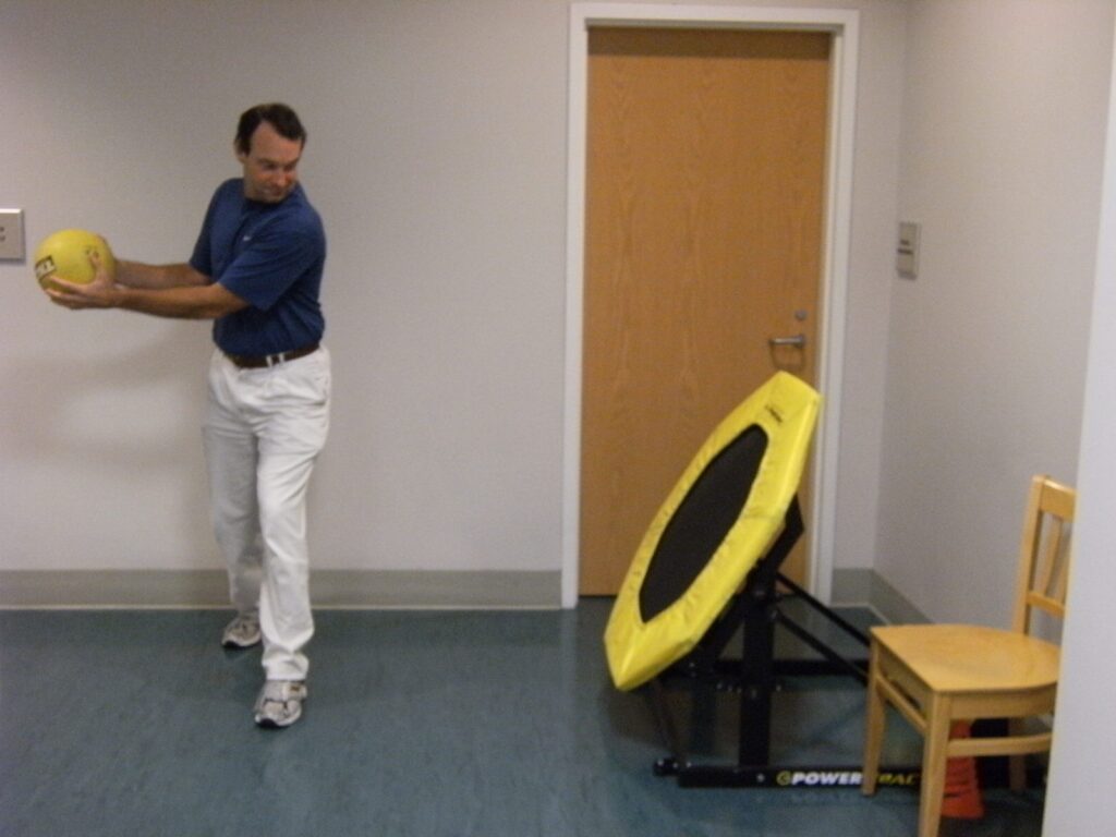 One such popular exercise is the side slam or toss. For this exercise you’ll need a partner. That partner could be a rebounder (as shown in the pictures below), a brick wall, or another person. Stand with your left side toward the rebounder/wall with your left foot forward and knee slightly bent. Take a weighted medicine ball in hand, swing it back around to your right as far as comfort permits, and then rotate toward the rebounder/wall, releasing and catching the ball. Repeat the sequence as recommended, getting controllably faster as you go, and getting more forceful on the slam/toss. Turn around and repeat with the right foot forward. This exercise can also be done in a ½ kneel position or while sitting on a stability ball. Very beneficial when done with another person.